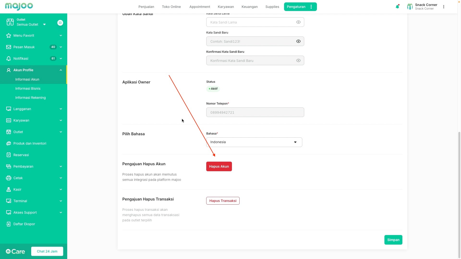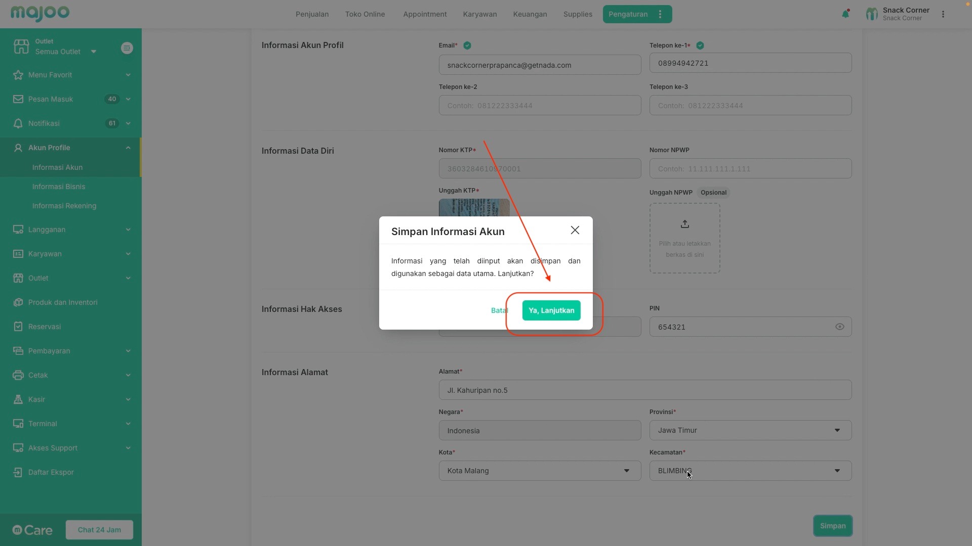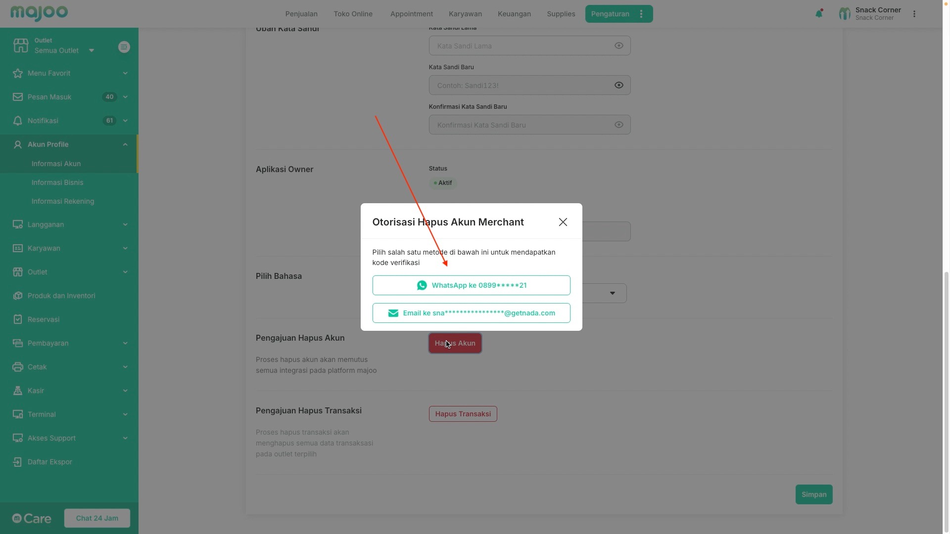 Melalui halaman Informasi Akun, Anda bisa melakukan perubahan data email, nomor kontak, alamat, PIN, dan password. Selain itu Anda juga bisa mengajukan hapus akun sesuai dengan kebutuhan outlet.