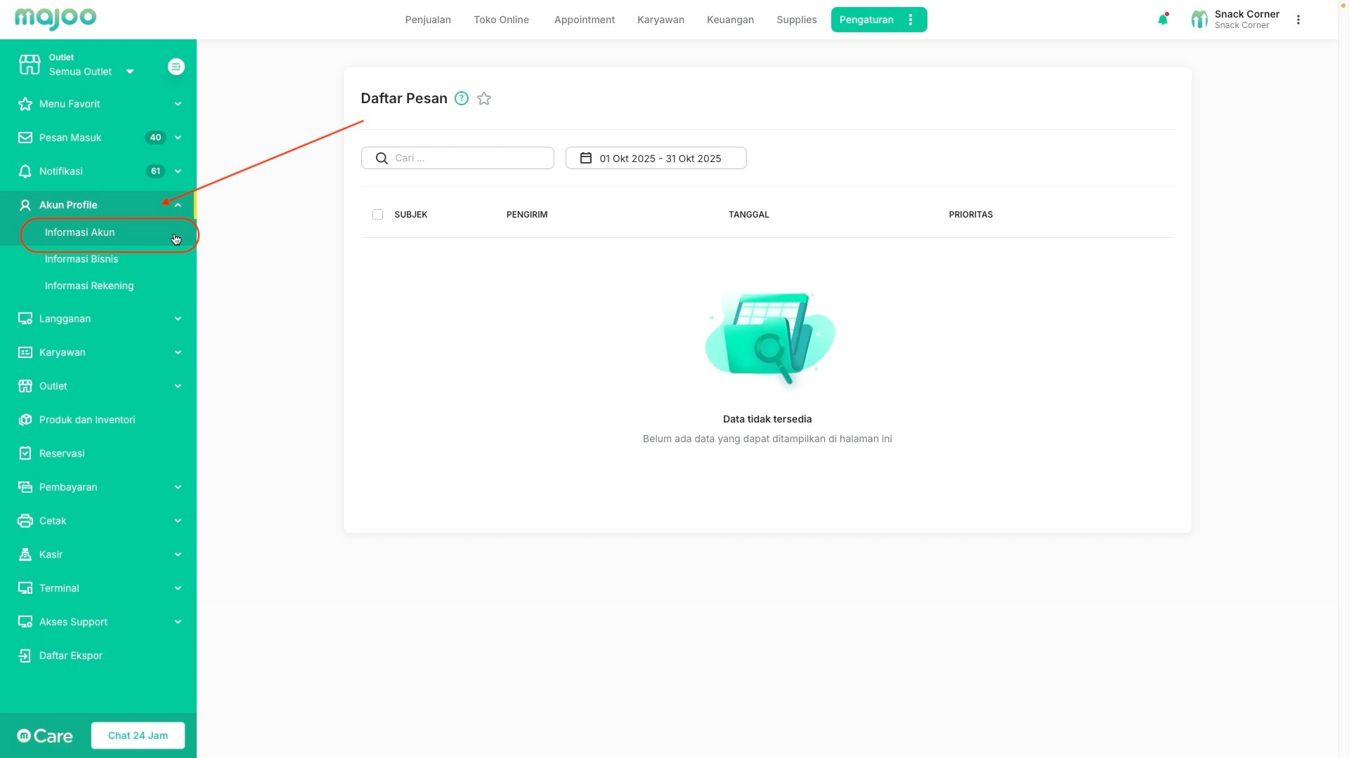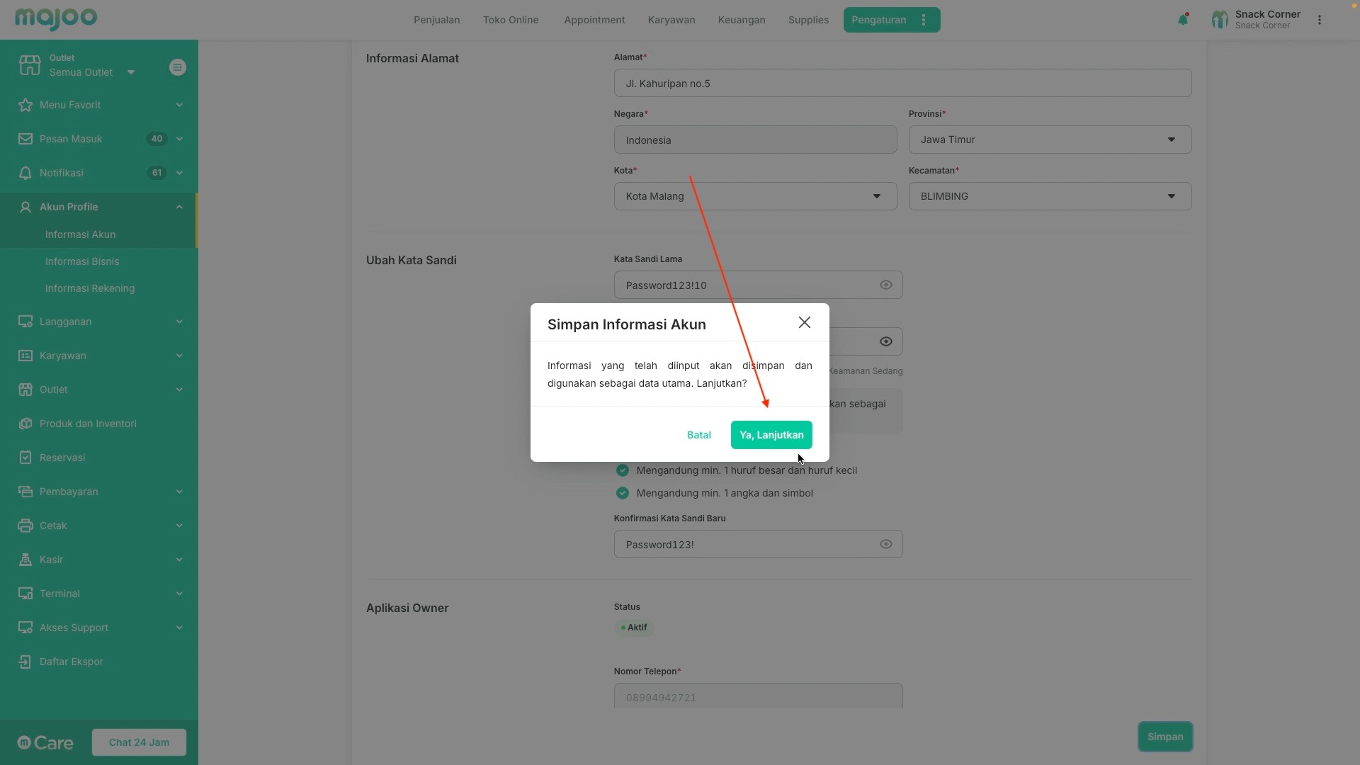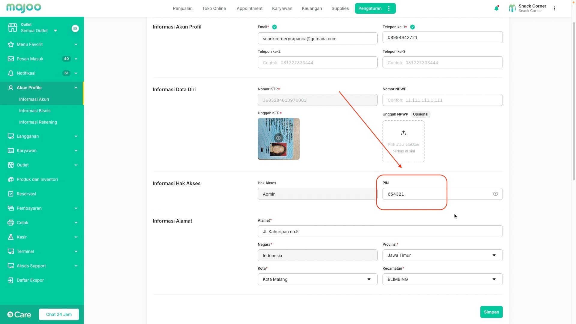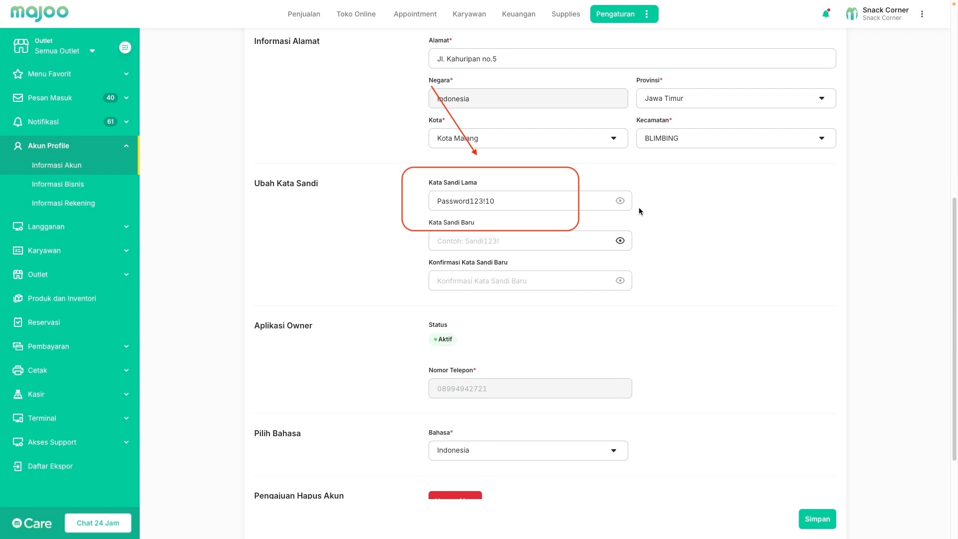 Melalui halaman Informasi Akun, Anda bisa melakukan perubahan data email, nomor kontak, alamat, PIN, dan password. Selain itu Anda juga bisa mengajukan hapus akun sesuai dengan kebutuhan outlet.