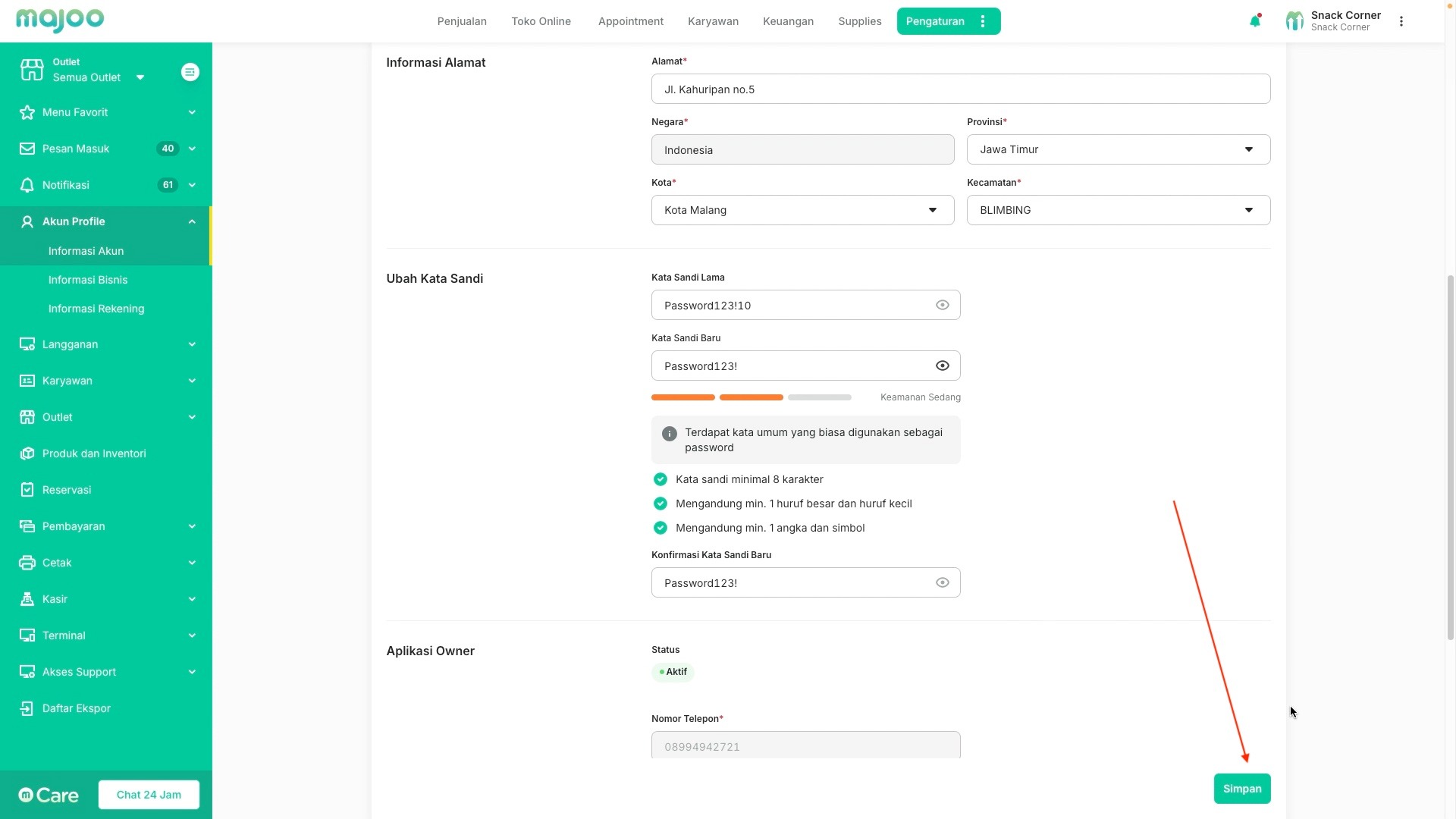 3. Masukkan kata sandi lama dan kata sandi baru sesuai dengan kebutuhan outlet
