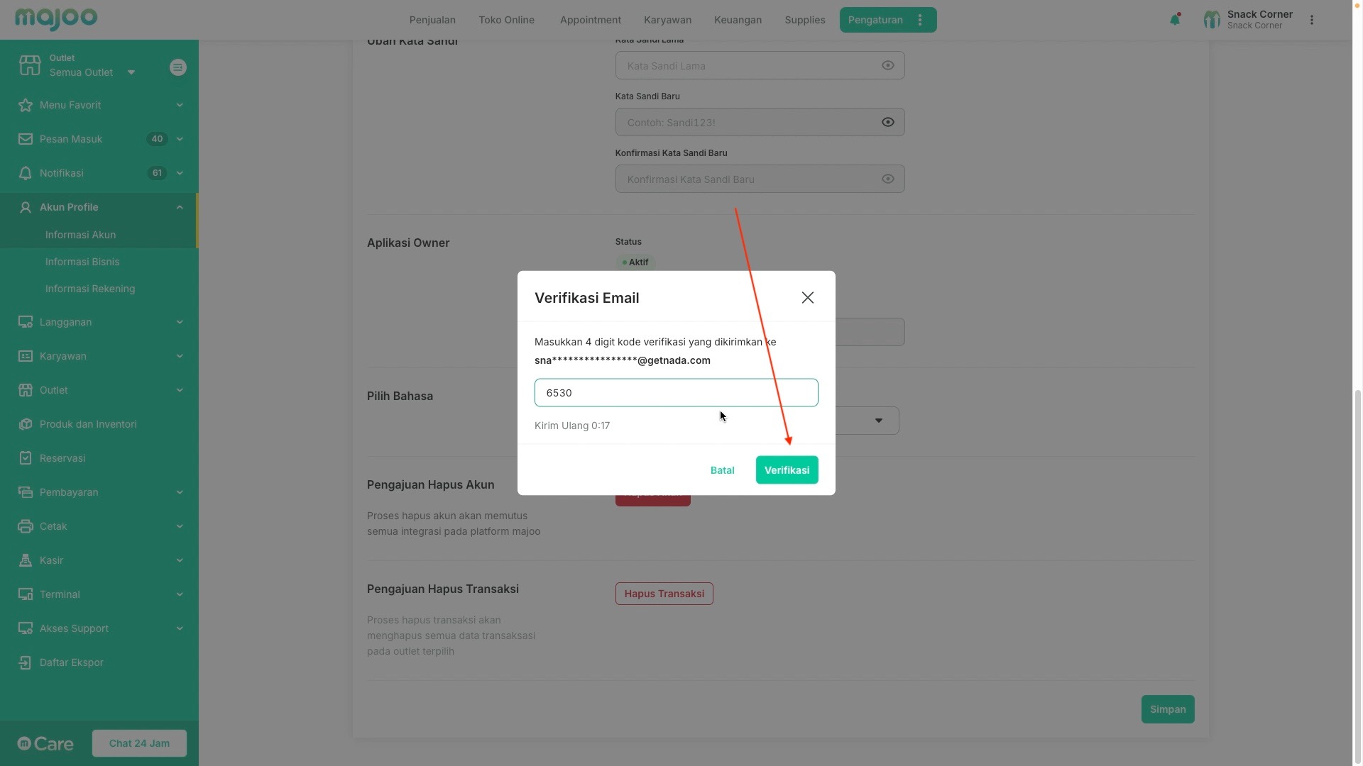 5. Masukkan kode verifikasi yang sudah dikirimkan, lalu klik Verifikasi