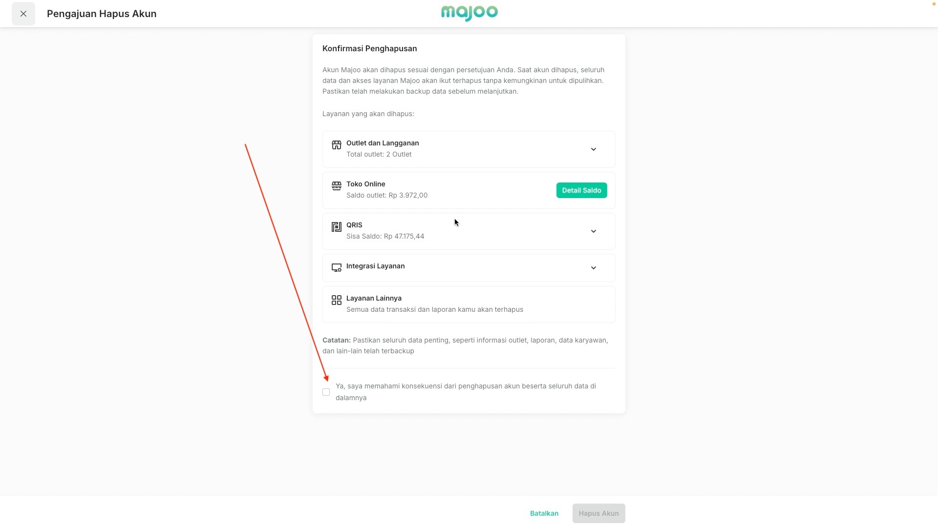 Berikut ini adalah beberapa langkah yang bisa Anda ikuti untuk mengajukan hapus akun melalui halaman Informasi Akun di dashboard majoo: