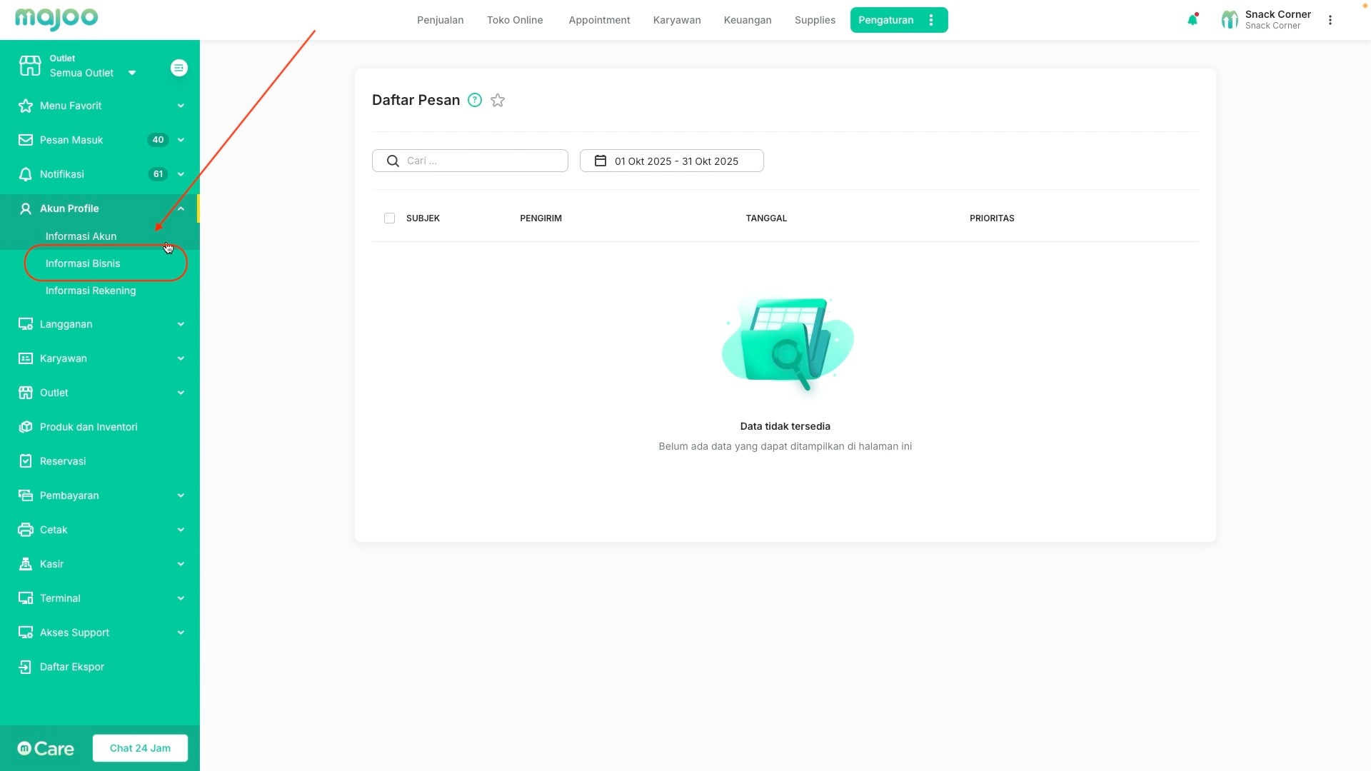 1. Login ke dashboard.majoo.id lalu pilih opsi Lainnya - Pengaturan - Akun Profile - Informasi Bisnis