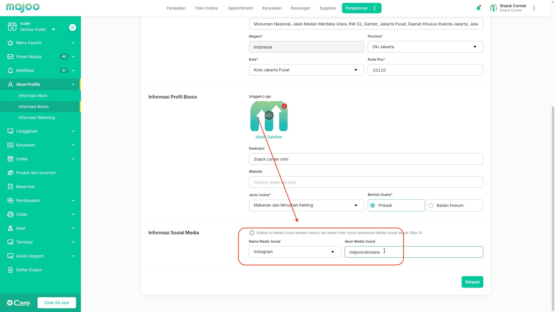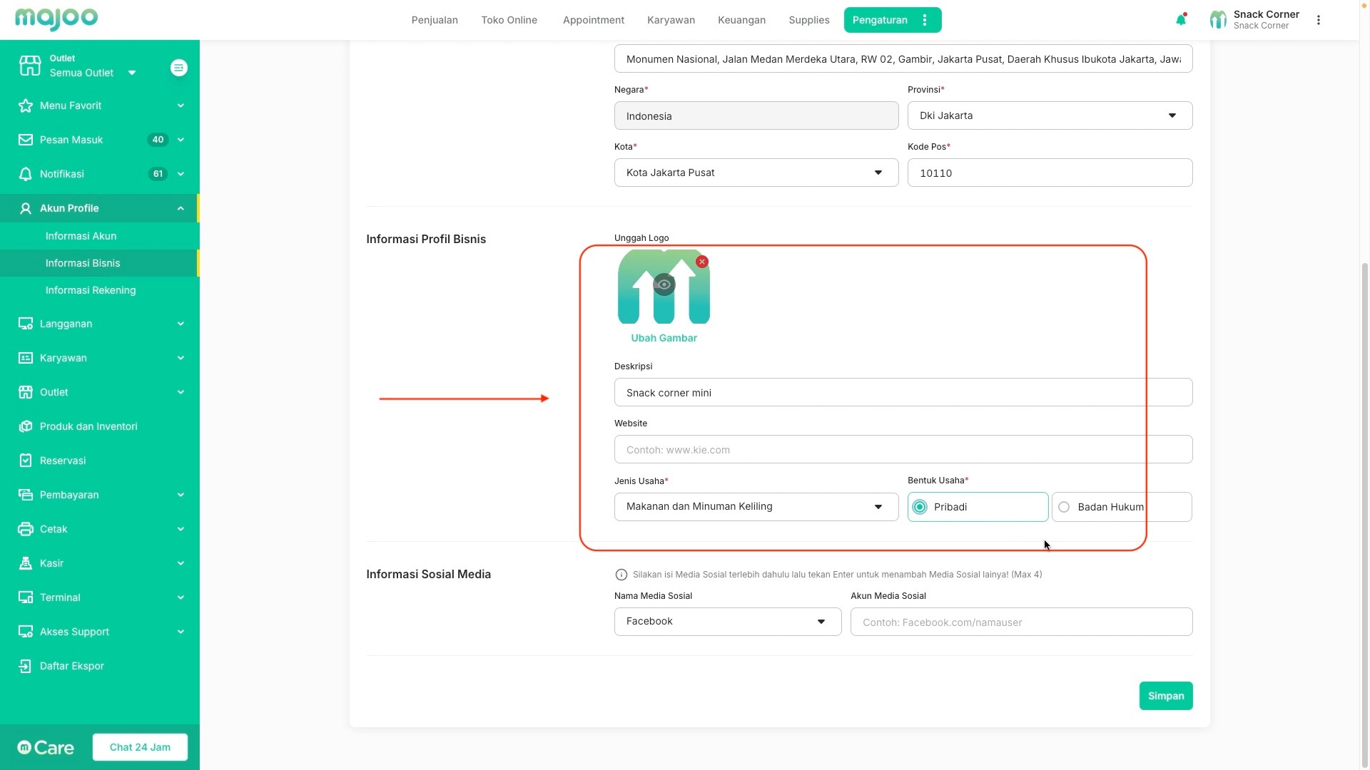 4. Fokus ke bagian Informasi Bisnis, lalu klik Ubah Gambar untuk mengubah logo outlet. Selanjutnya Anda bisa mengisi form deskripsi, website, jenis usaha, dan bentuk usaha sesuai dengan kebutuhan outlet
