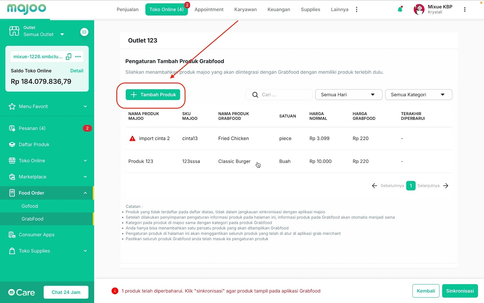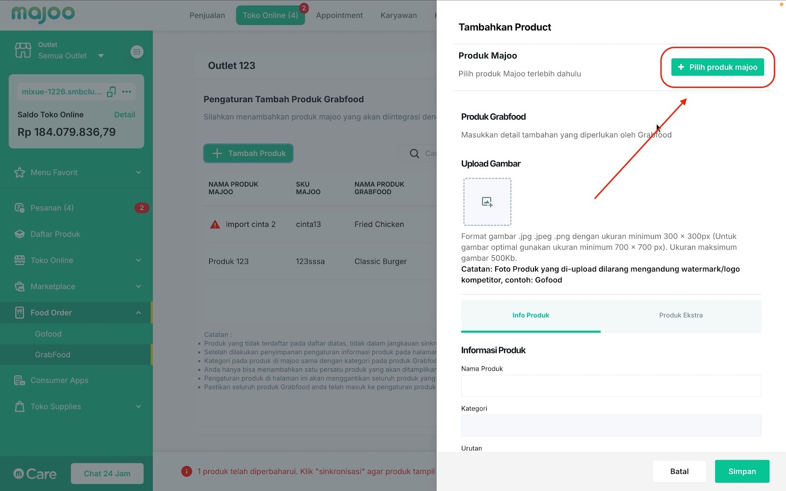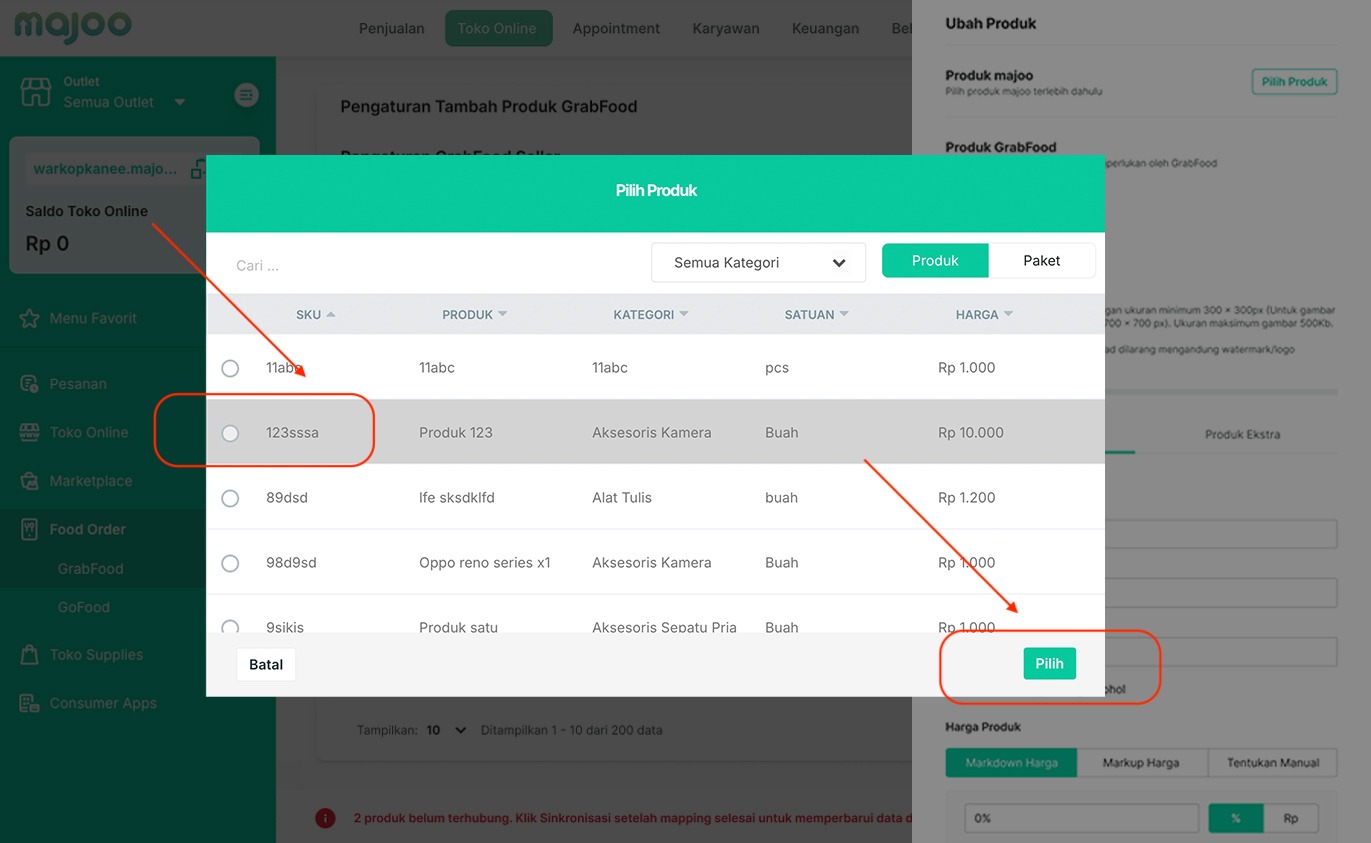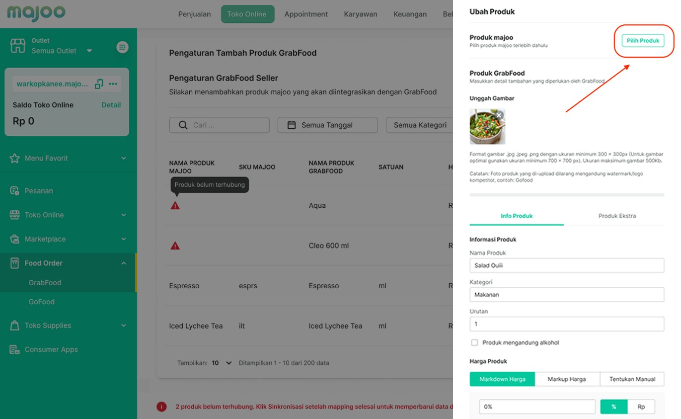 Setelah proses integrasi GrabFood berhasil, Anda wajib melakukan pemetaan produk. Hal ini penting untuk memastikan database produk di aplikasi GrabFood selaras dengan database produk di aplikasi majoo, karena ada kemungkinan ada produk sejenis yang menggunakan nama berbeda di dua platform tersebut. Misalnya: Ayam Crispy di aplikasi GrabFood dan Ayam Krispi di aplikasi majoo.
