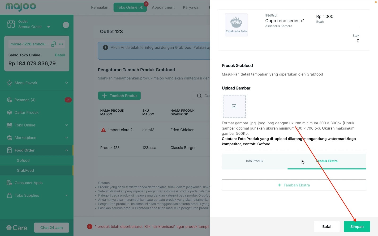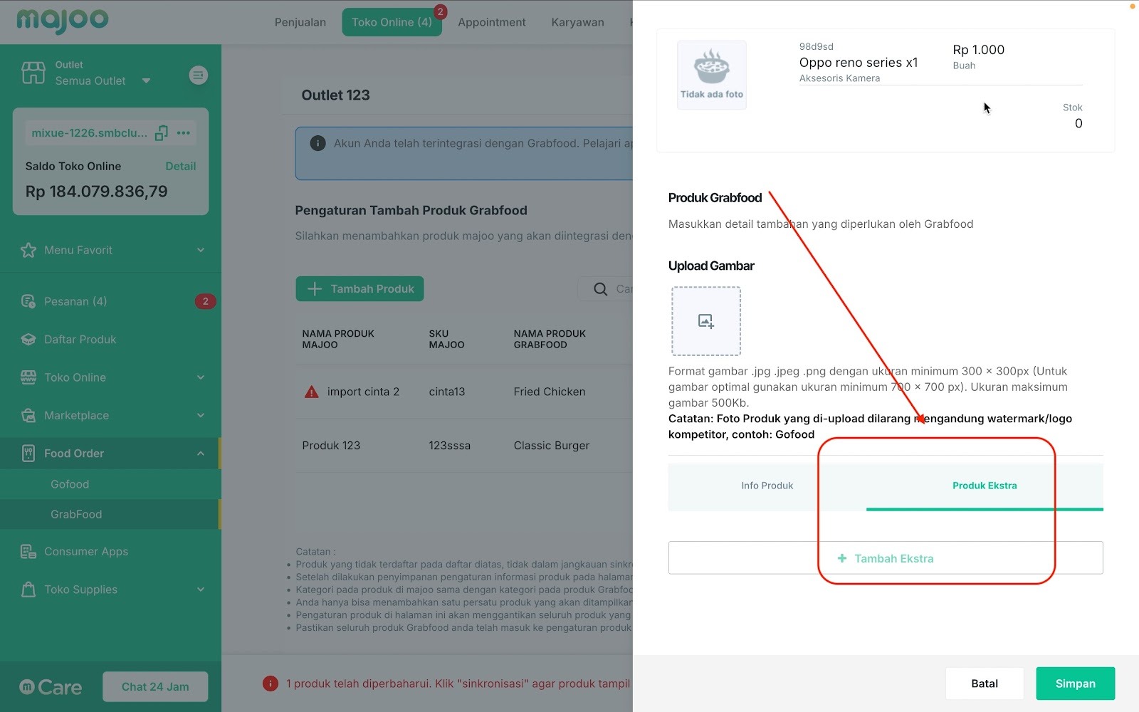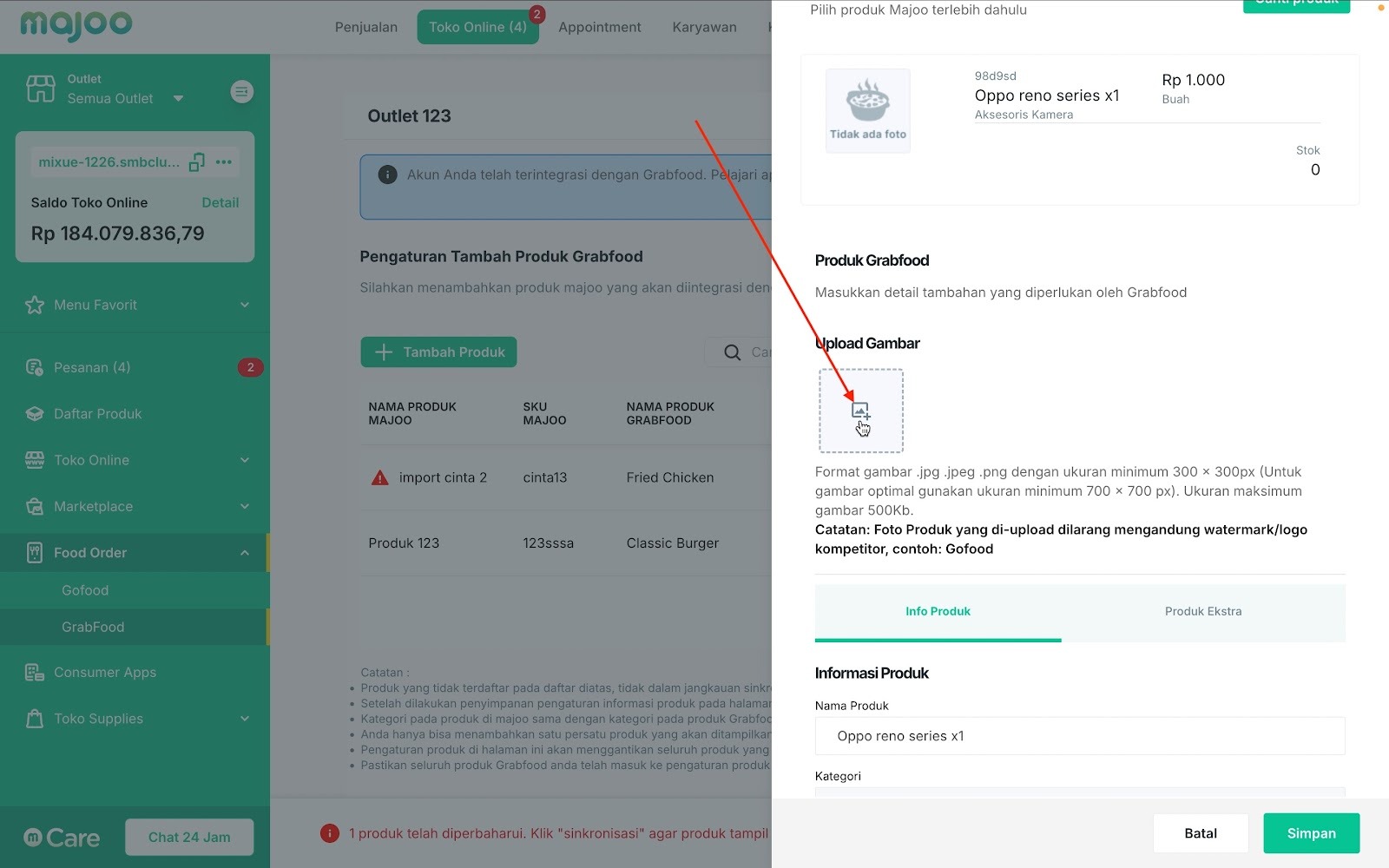 Setelah proses integrasi GrabFood berhasil, Anda wajib melakukan pemetaan produk. Hal ini penting untuk memastikan database produk di aplikasi GrabFood selaras dengan database produk di aplikasi majoo, karena ada kemungkinan ada produk sejenis yang menggunakan nama berbeda di dua platform tersebut. Misalnya: Ayam Crispy di aplikasi GrabFood dan Ayam Krispi di aplikasi majoo.