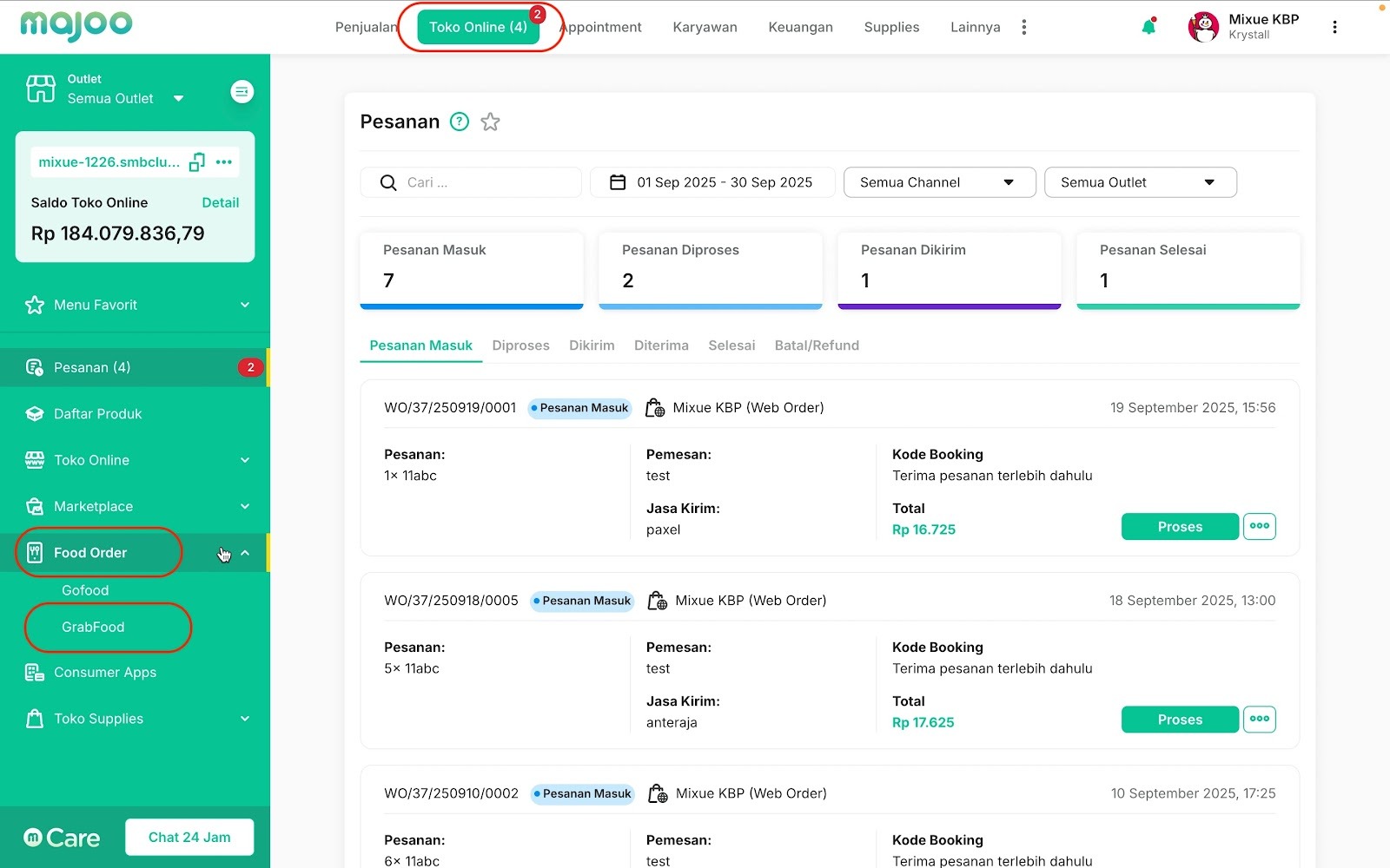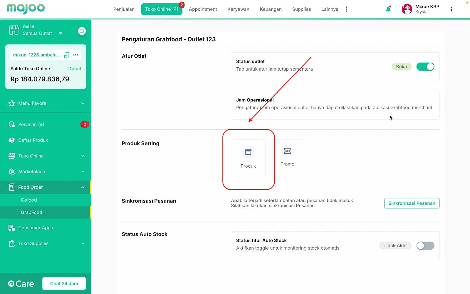 1. Login ke dashboard majoo dan pilih opsi Toko Online - Food Order - GrabFood