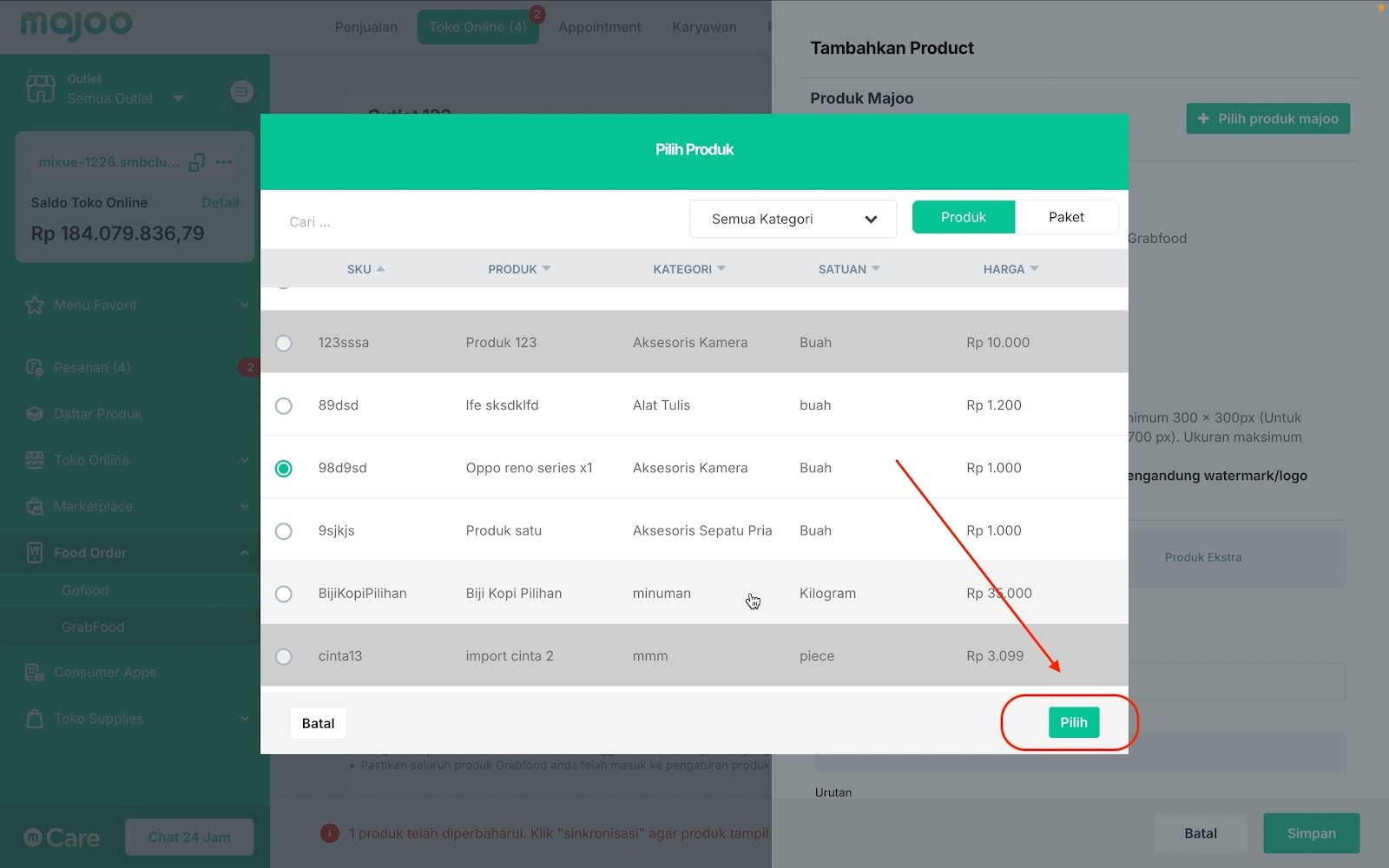 6. Pilih produk majoo yang sesuai dan klik Pilih