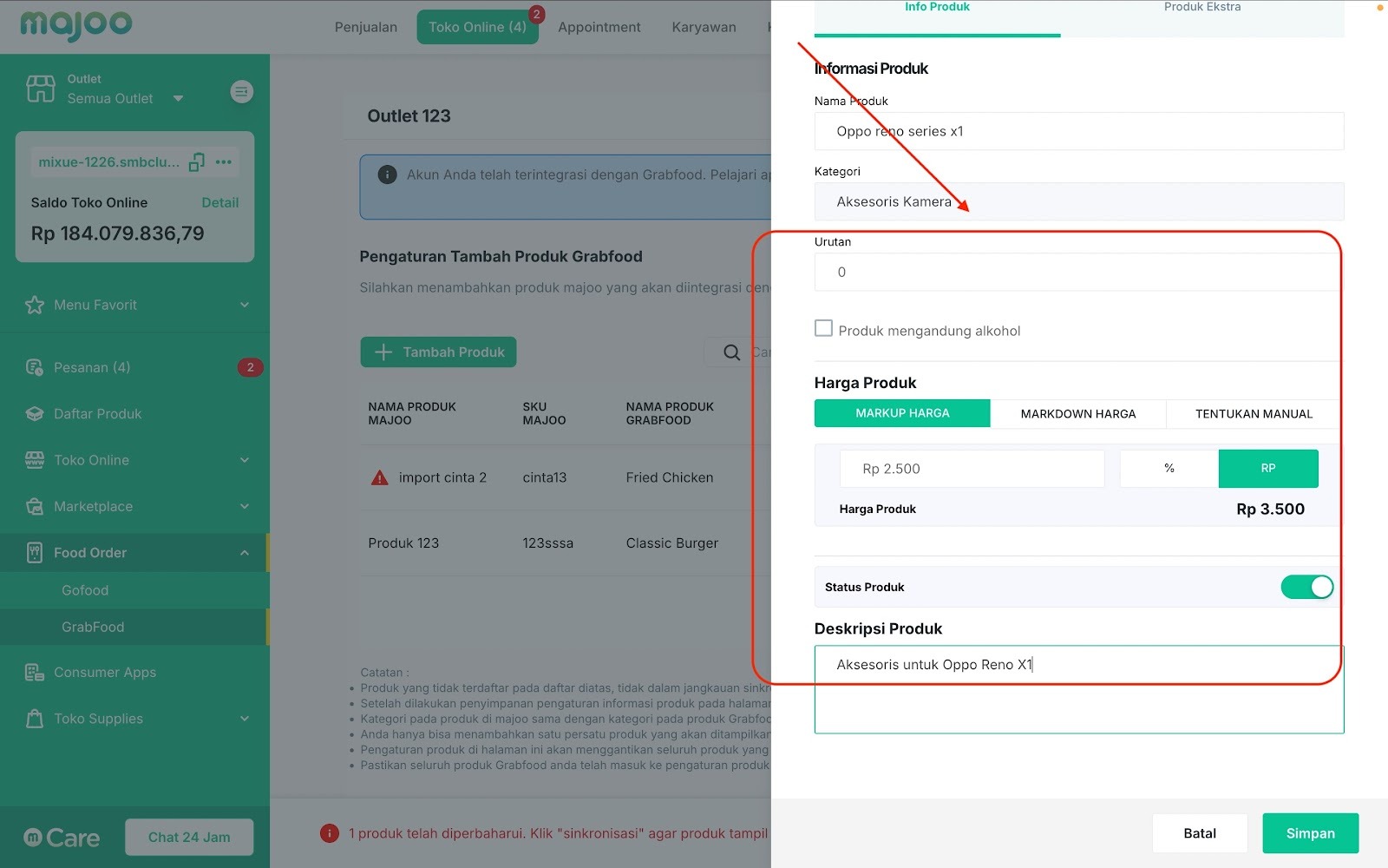 7. Klik di tab Info Produk, lalu lakukan pengaturan sesuai kebutuhan. Ceklis opsi Produk Mengandung Alkohol jika produk memiliki kandungan alkohol. Lakukan markup atau markdown harga sesuai kebutuhan outlet. Pastikan toggle status dalam kondisi on. Isi deskripsi jika dirasa perlu.