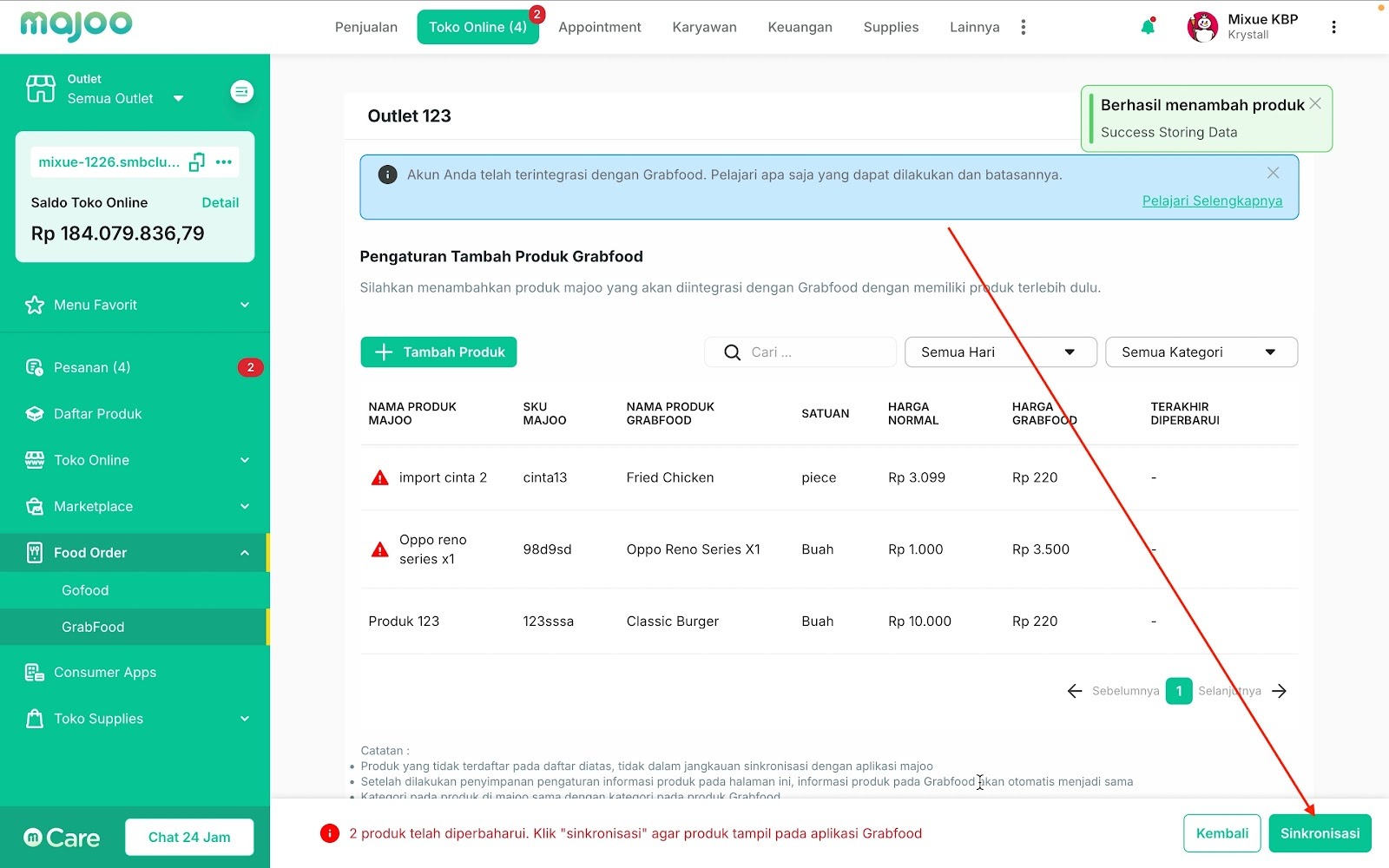 1. Setelah proses aktivasi selesai dan Anda melakukan refresh di dashboard majoo, layar akan menampilkan daftar produk yang berhasil diekspor dari database Grab dan dipetakan ke database majoo. Sementara itu, ikon tanda seru menandakan bahwa produk terkait belum berhasil dipetakan dan Anda wajib melakukan pemetaan secara manual