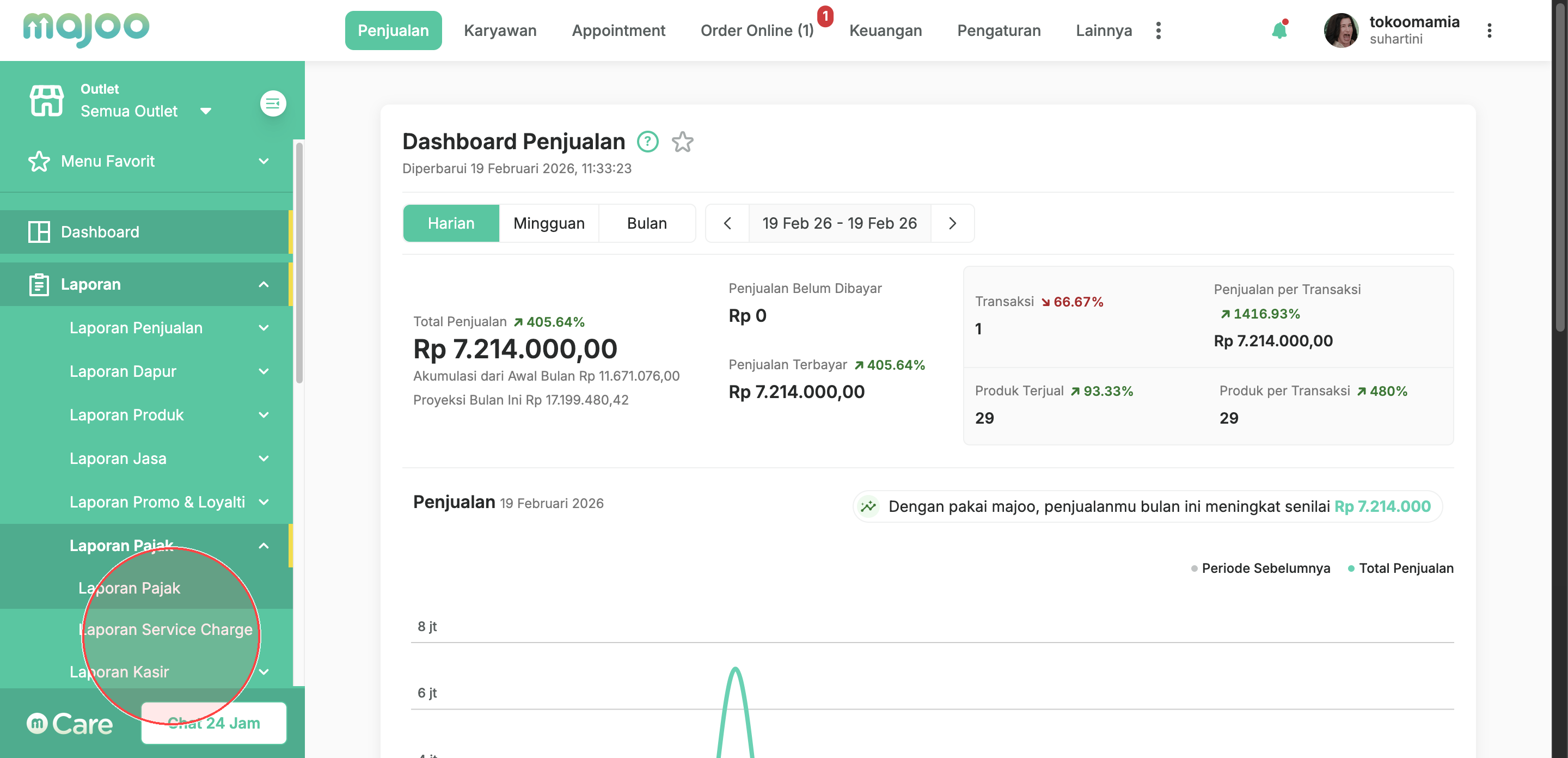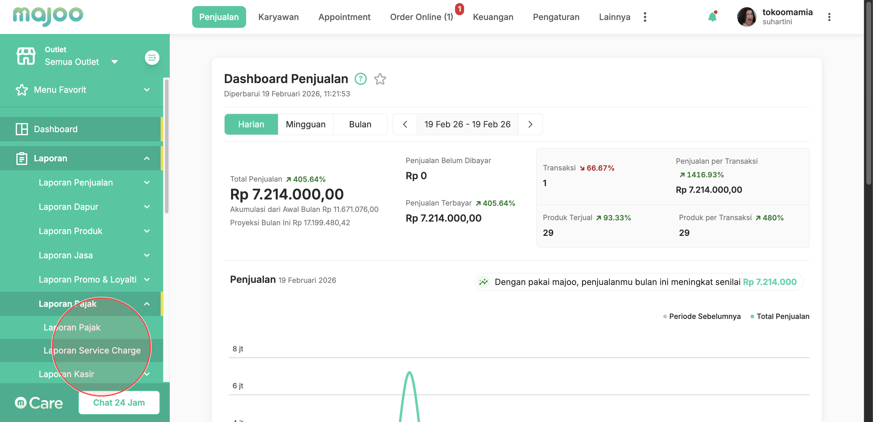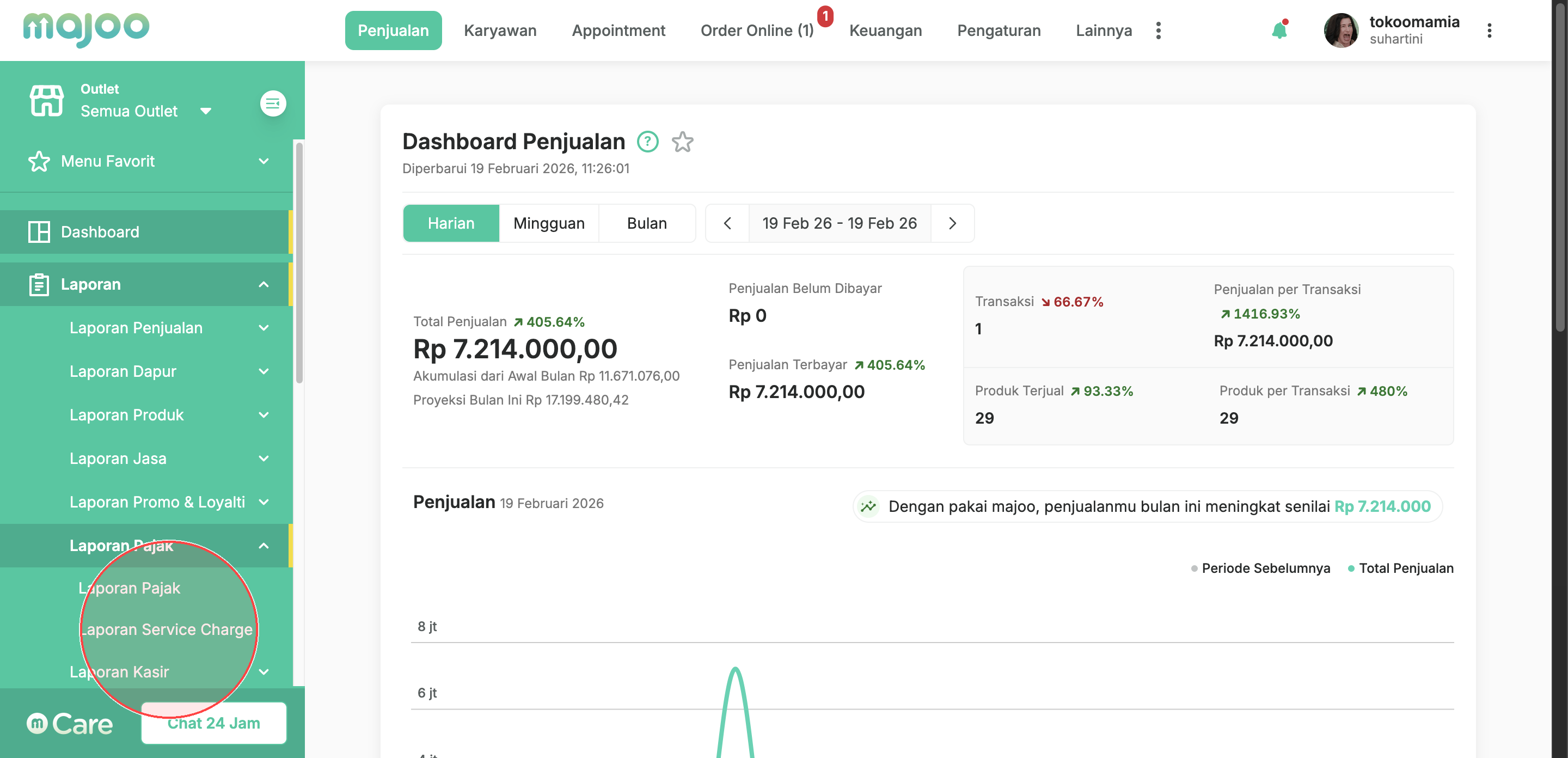 1. Login ke dashboard majoo, lalu pilih opsi Penjualan (di bagian atas layar) - pilih Laporan - Laporan Pajak - Laporan Service Charge