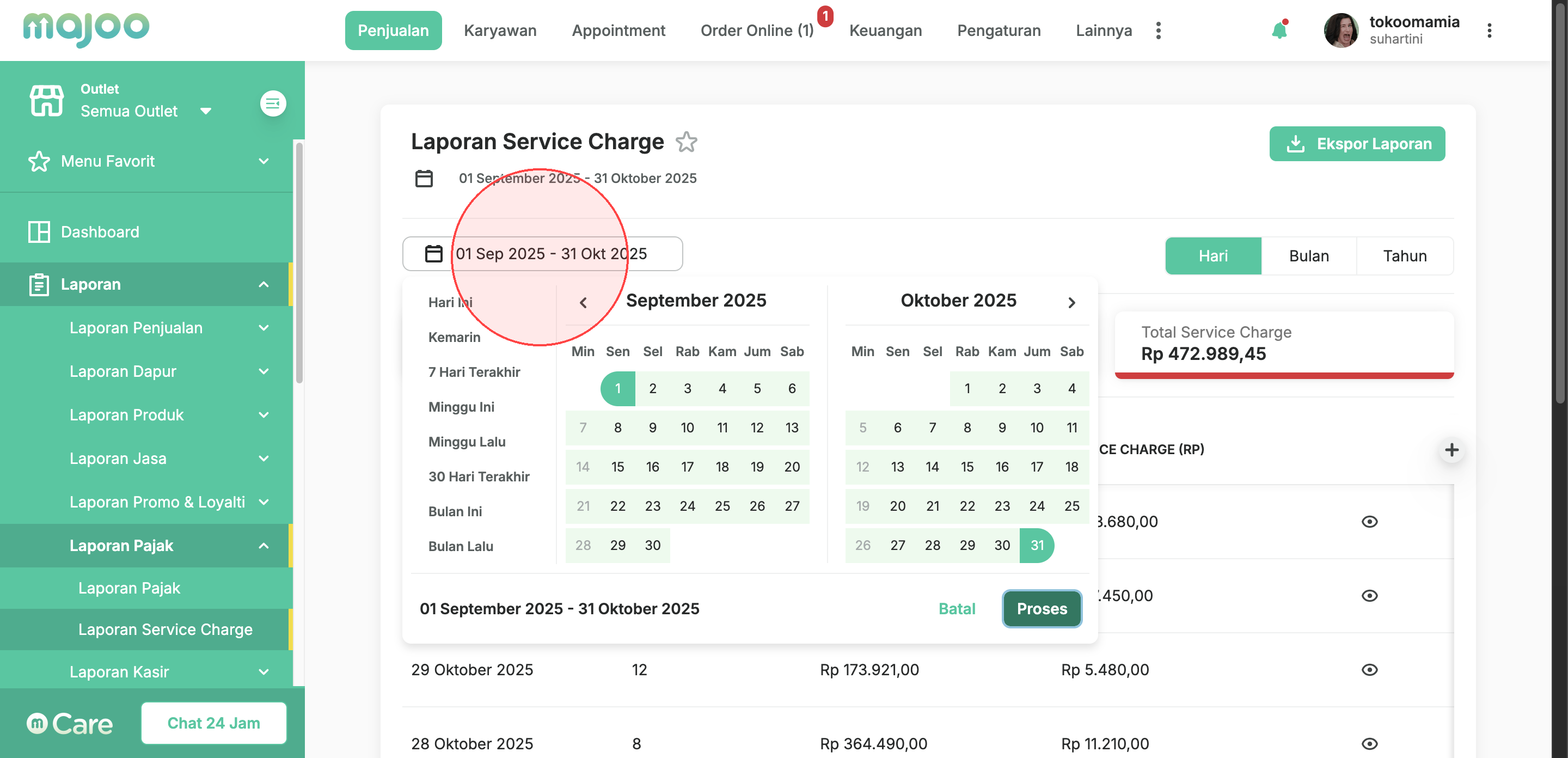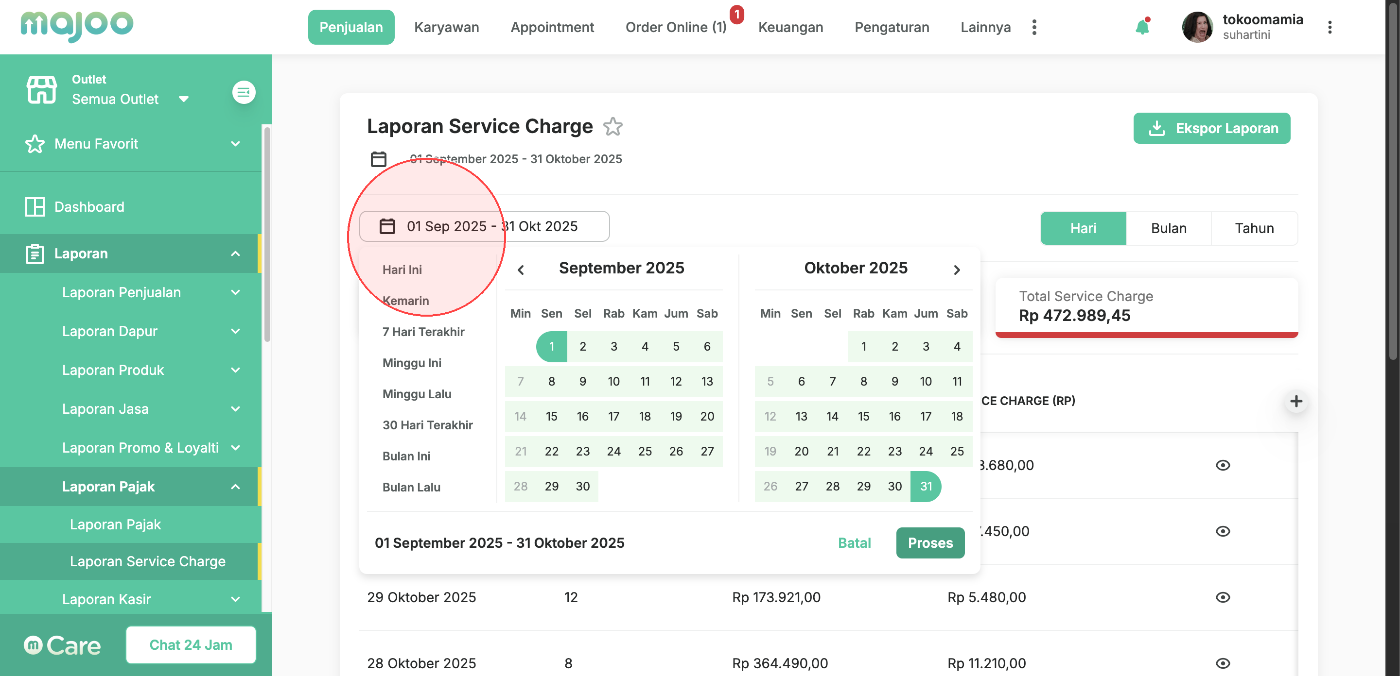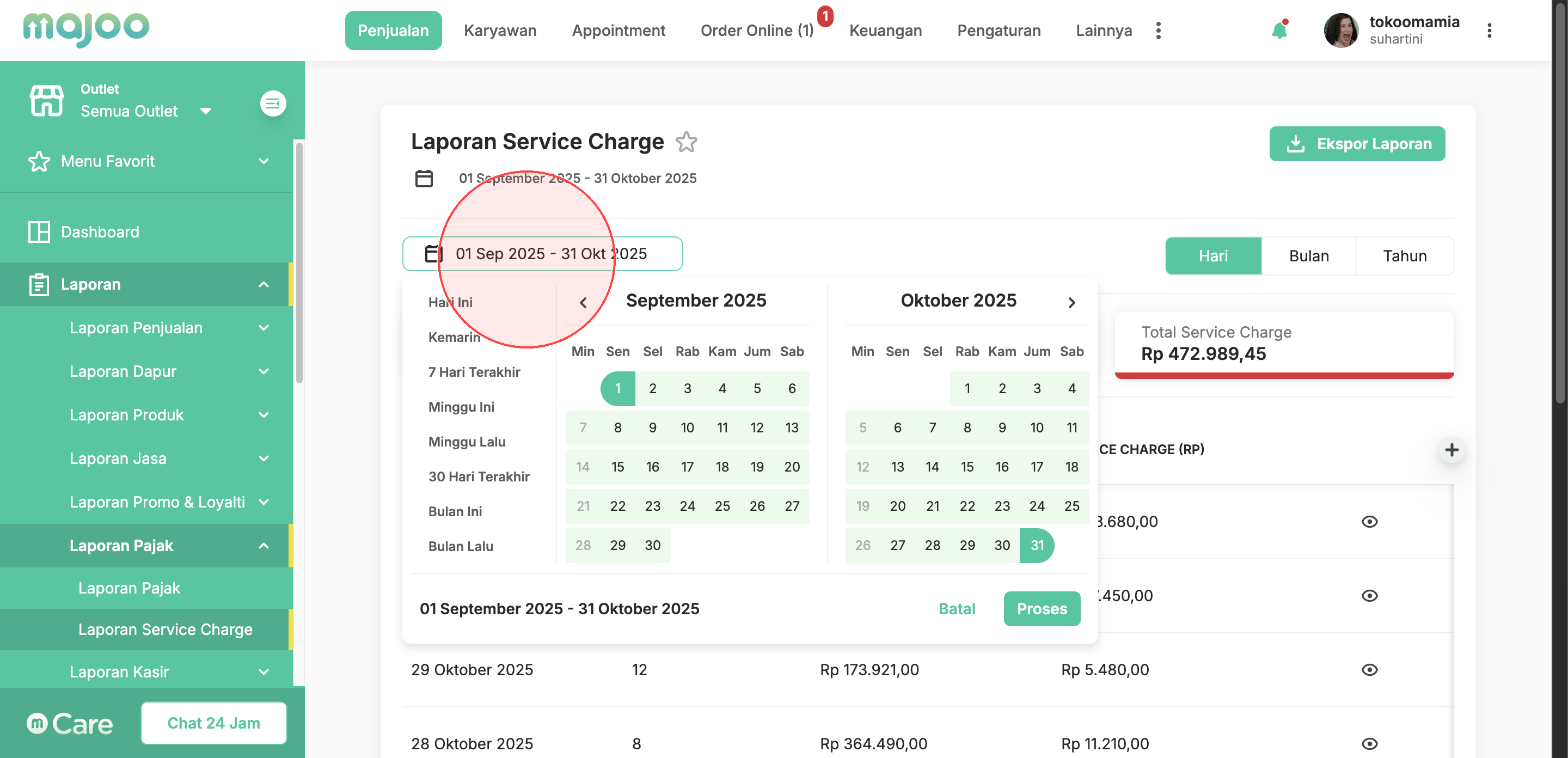 2. Setelah masuk halaman Laporan Service Charge, gunakan filter kalender untuk membuat sistem menampilkan data laporan biaya layanan dari periode waktu tertentu - sesuai kebutuhan outlet