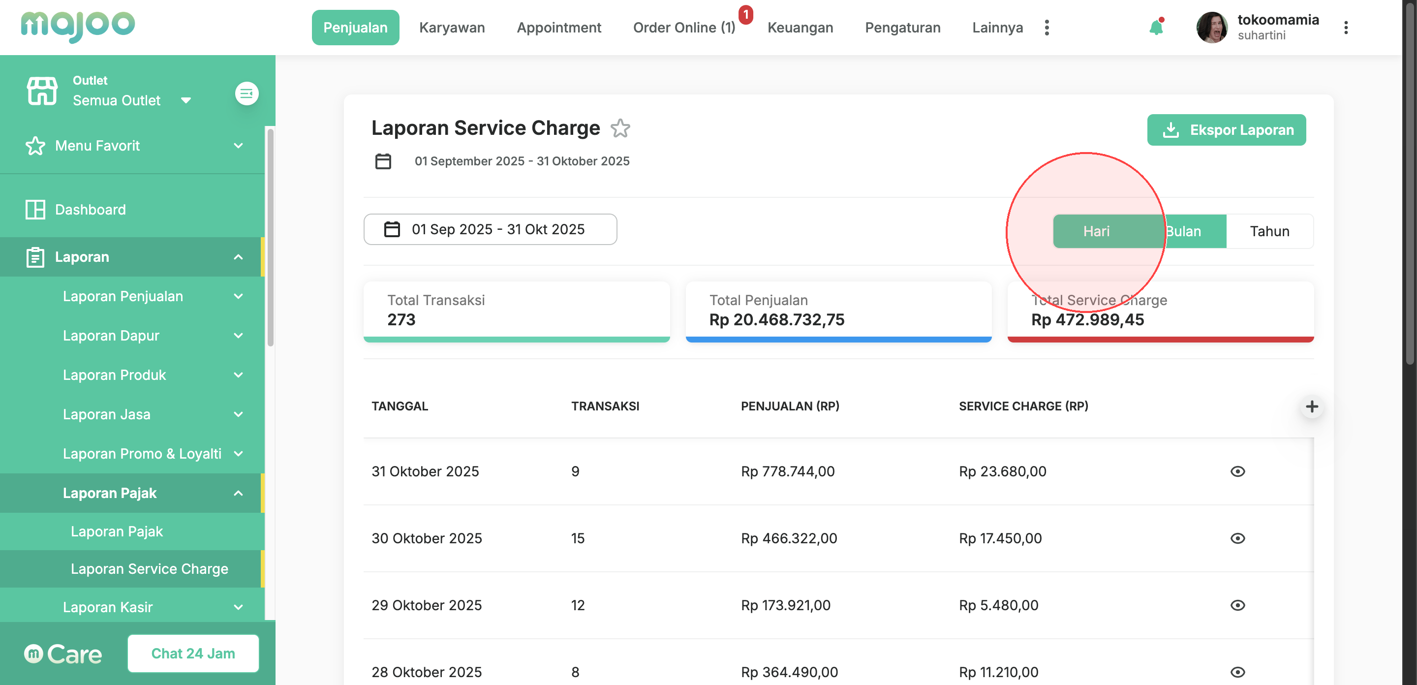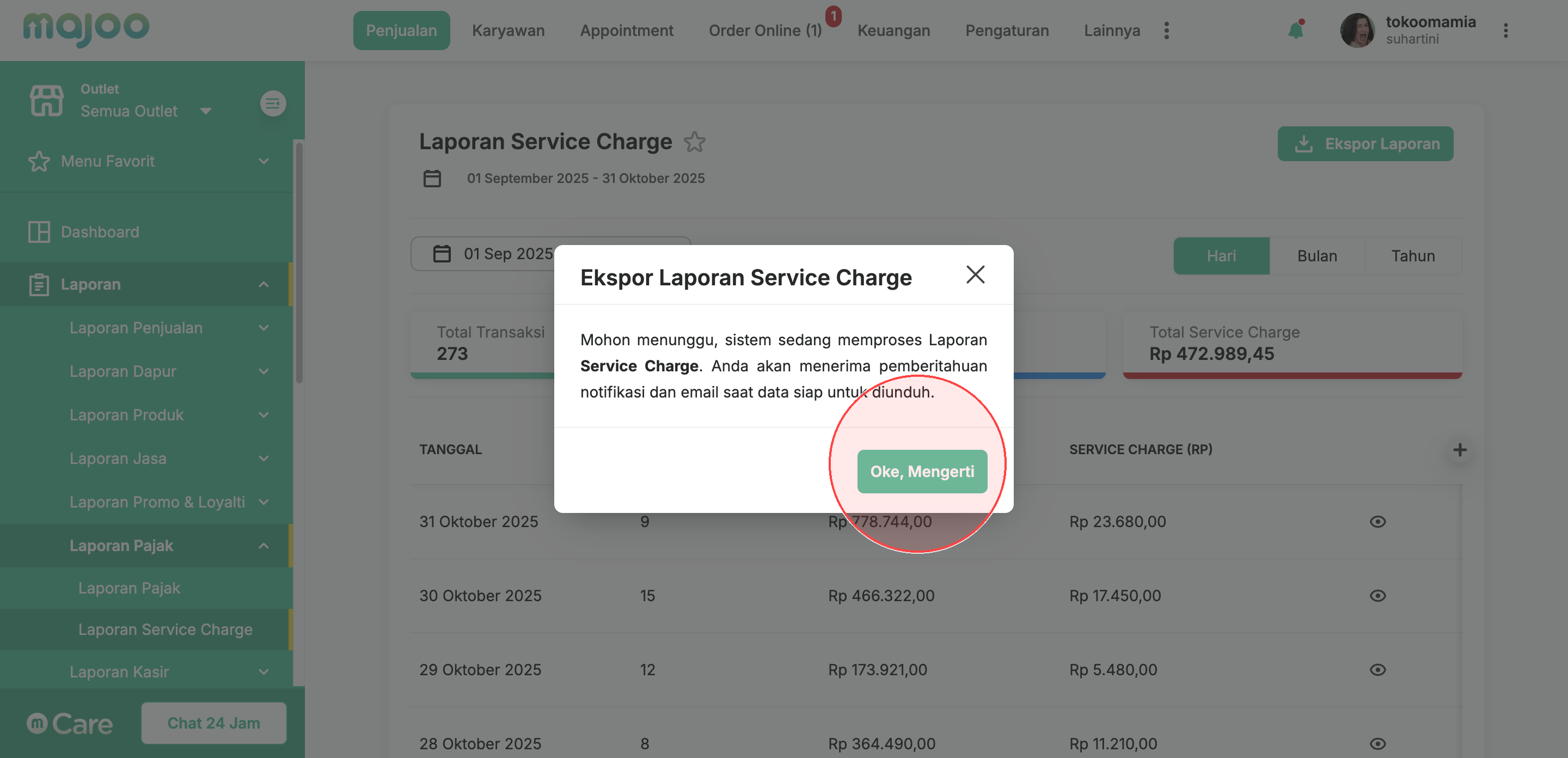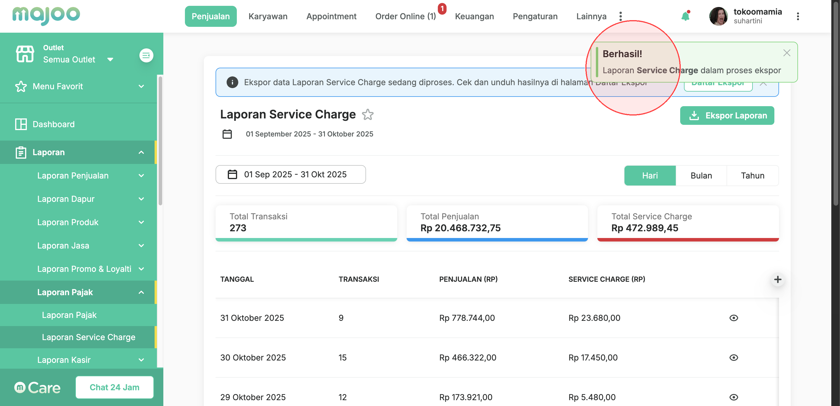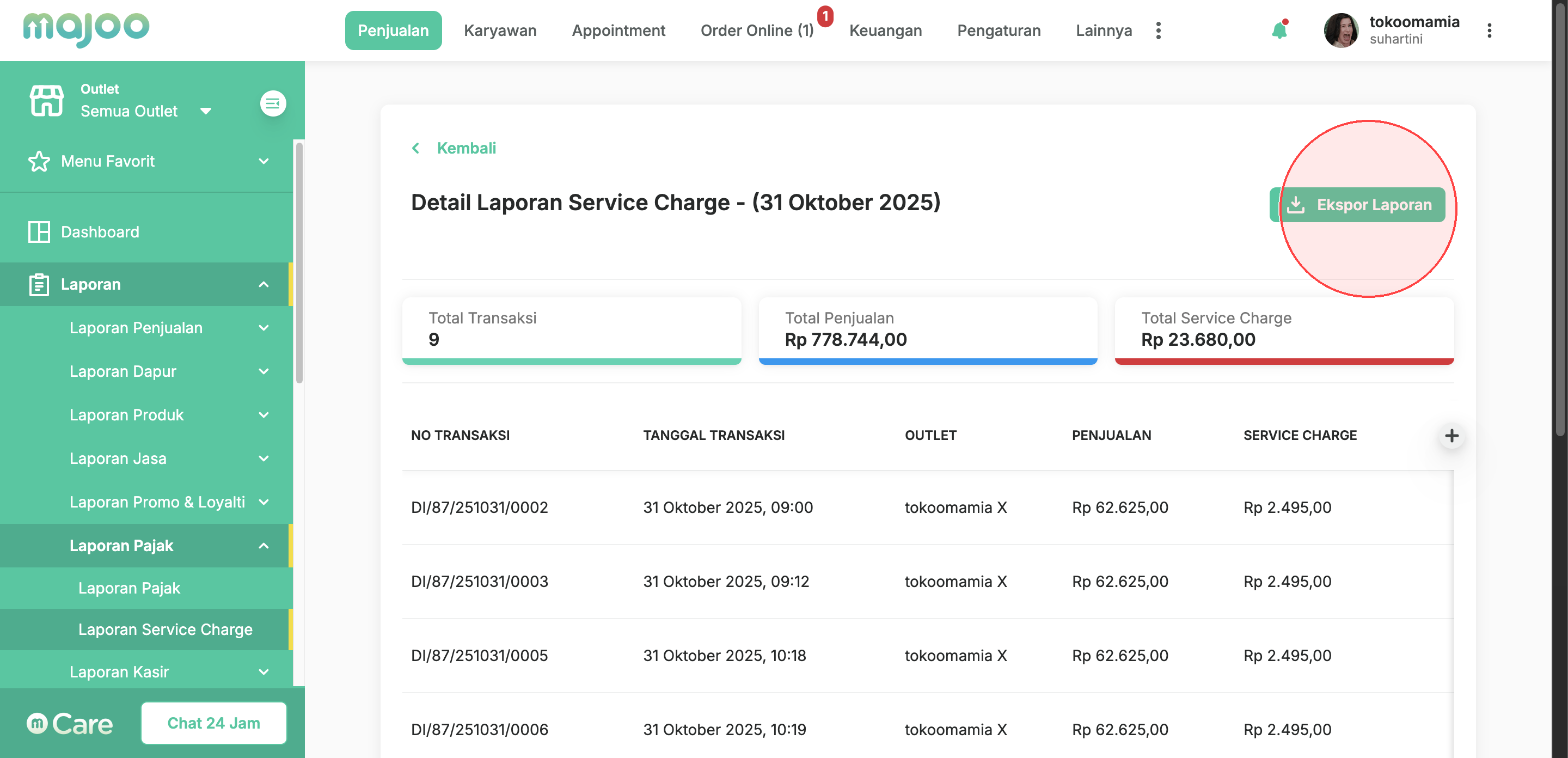 Berikut ini adalah beberapa langkah yang bisa Anda ikuti untuk men-download detail laporan service charge melalui dashboard majoo: