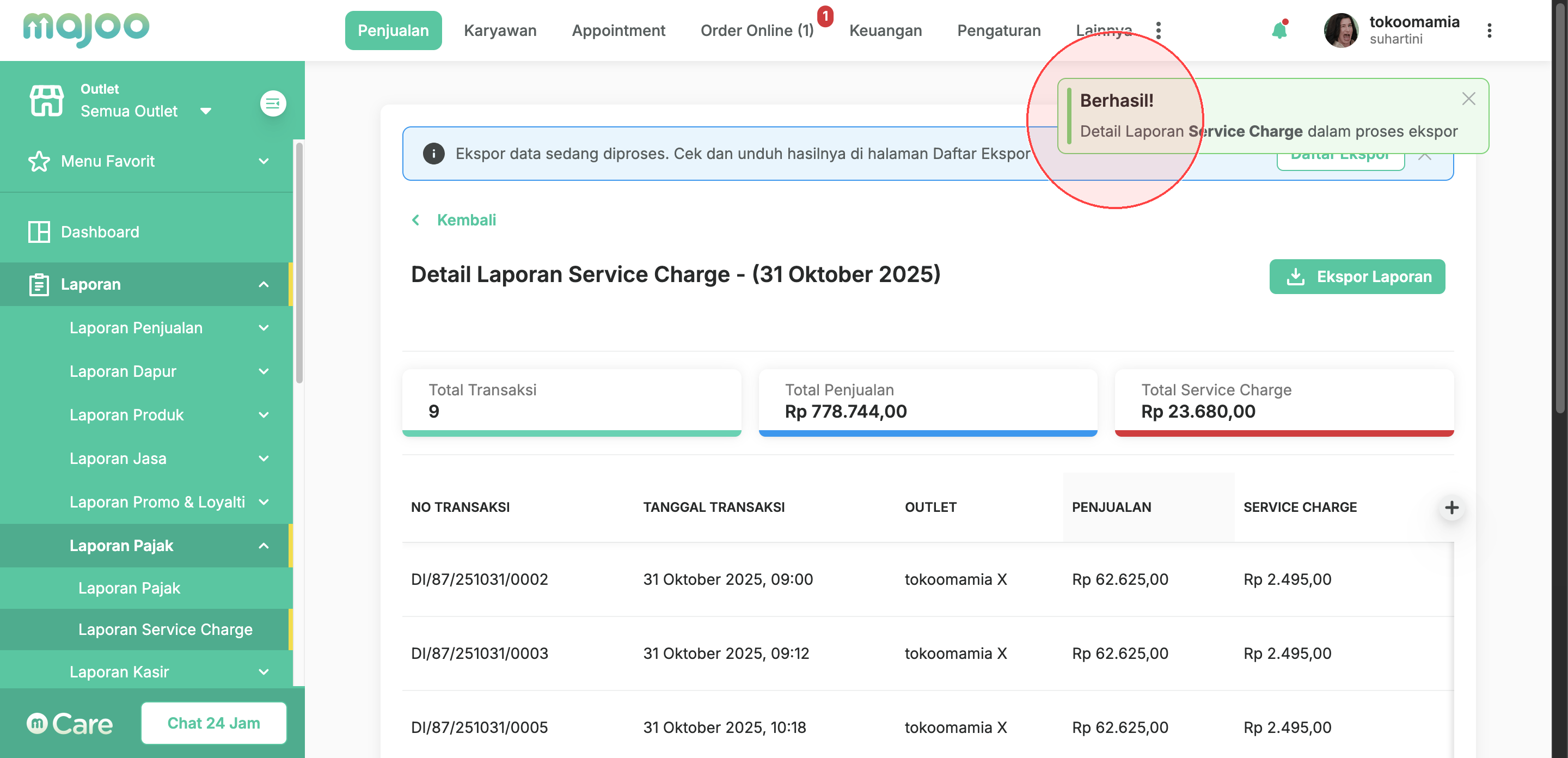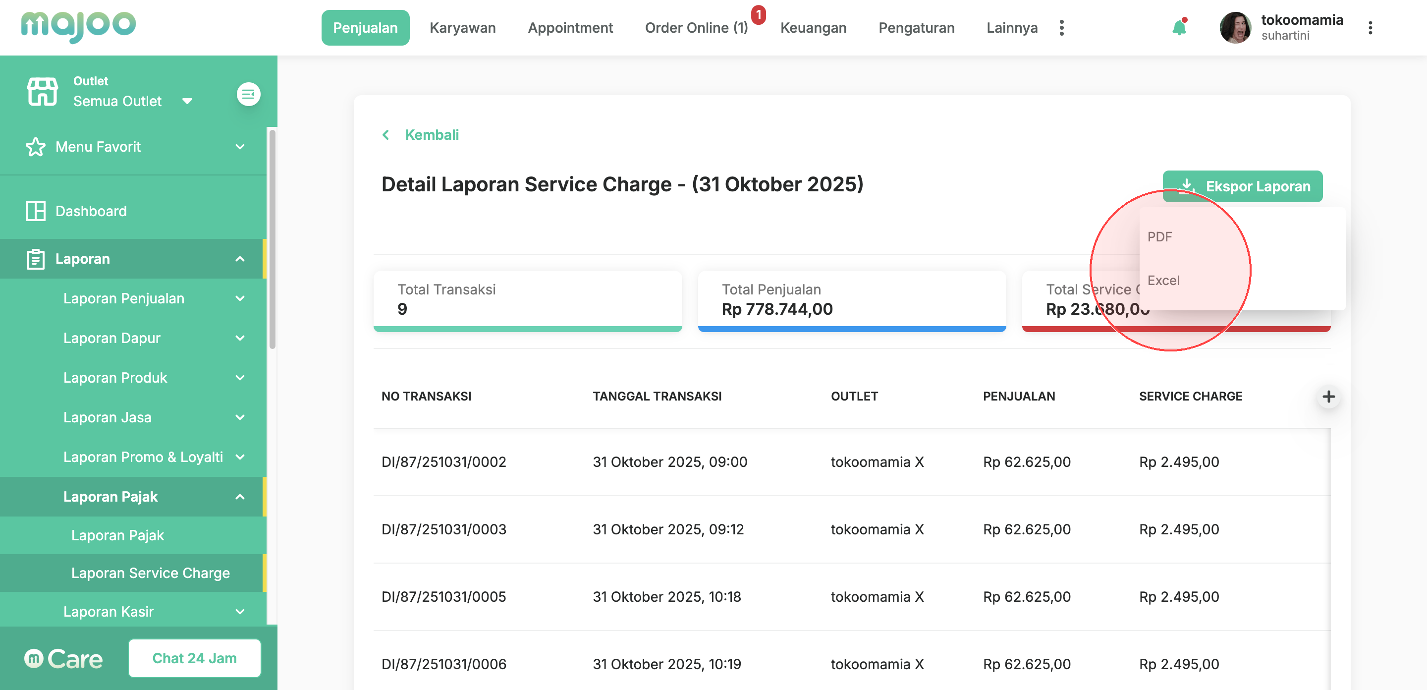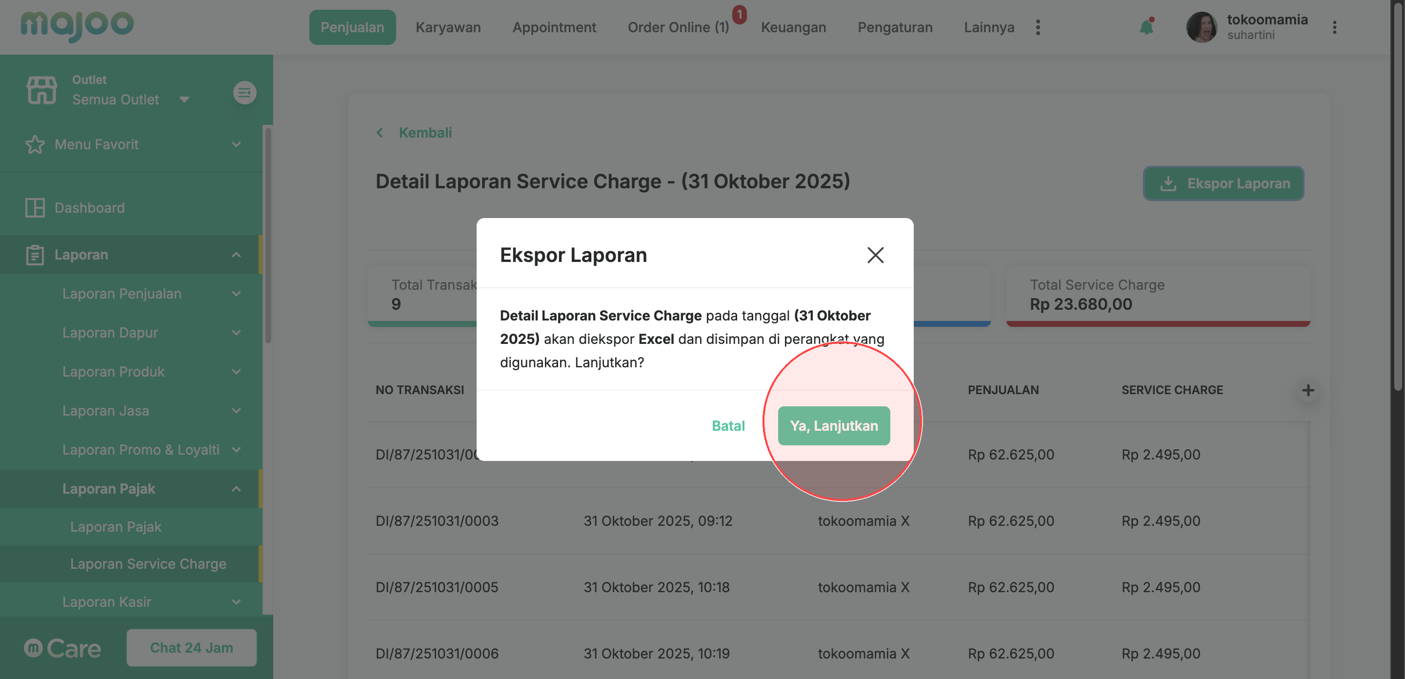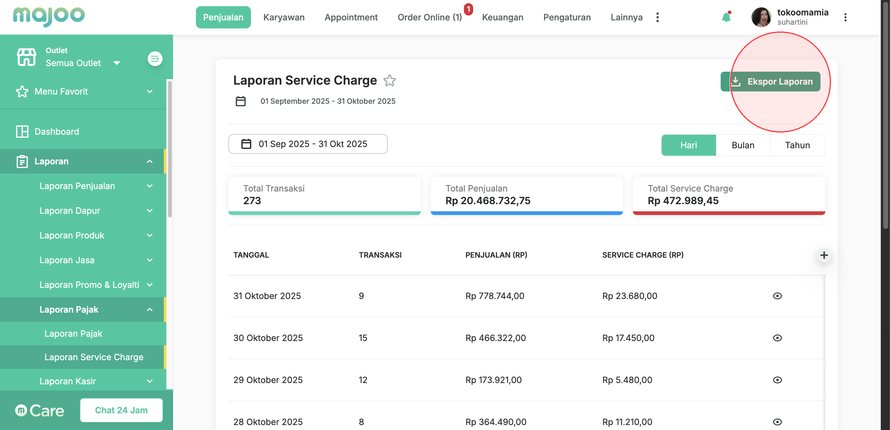 Berikut ini adalah beberapa langkah yang bisa Anda ikuti untuk men-download detail laporan service charge melalui dashboard majoo: