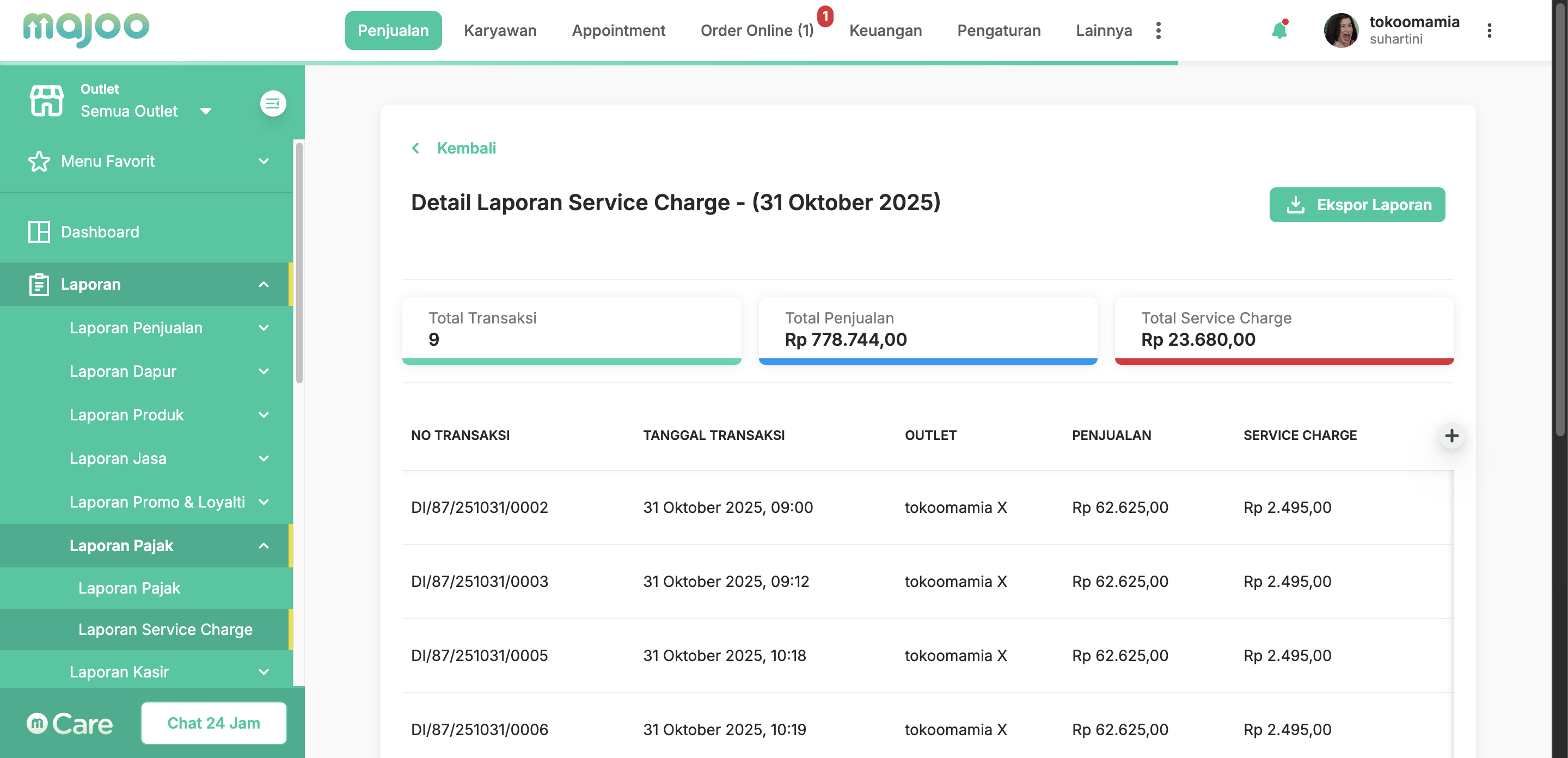 Melalui halaman Laporan Service Charge, Anda bisa membaca secara lengkap data perhitungan biaya layanan untuk semua transaksi yang tercatat di sistem majoo. Anda juga bisa dengan mudah mem-filter laporan berdasarkan periode hari, bulan, maupun tahun - sesuai dengan kebutuhan outlet.