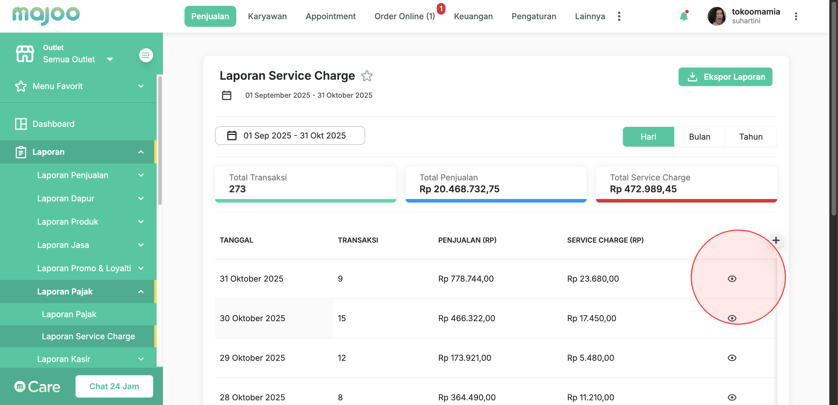 4. Selanjutnya untuk membaca detail laporan service charge, Anda bisa klik ikon mata